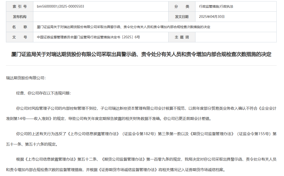 而每经资本眼专栏记者还注意到瑞达期货作为A股上市公司,继去年同期被海南证监局处罚之后,今年4月30日又因内控问题再次被厦门证监局出具警示函。