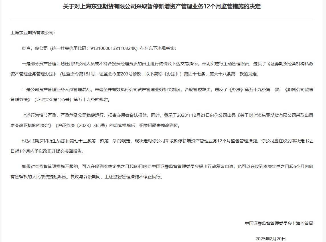 在2024年,信息技术风险在罚单中占比超过50%,是当时的主要风险点。而到了2025年,资管业务风险隔离缺失成为新的风险高发领域。东亚期货因资管业务失控受到严厉处罚:由于放任非公司人员下达交易指令、人员管理混乱且屡次整改不力,被上海证监局暂停新增资管业务12个月,这是年内目前为止最为严厉的处罚,公司董事长、总经理等6名高管也同步被追责。