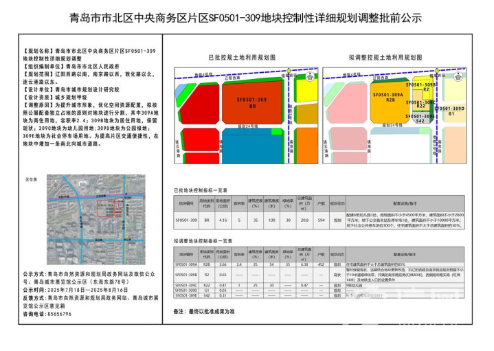 在此背景下,为提升城市形象,优化空间资源配置,7月18日,青岛市自然资源和规划局发布《市北区中央商务区片区SF0501-309地块控制性详细规划调整批前公示》,拟按照公服配套独立占地的原则对地块进行分割,其中309A地块为商住用地,面积2.66公顷,容积率2.4,建筑密度≤25%,限高54米,绿地率≥35%,总建面6.38万㎡(住宅建面≤85%),规划户数452户,推算户均面积120㎡,未来该地块可能打造低密宜居社区,有望成为片区内难得的高端改善型住宅。